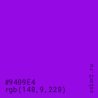 Цвет #9409E4 в цветовой модели RGB обозначается тремя октетами (148, 9, 228) в десятичном формате и #9409E4 в шестнадцатиричном (hex) формате, которые являются интенсивностью красного 148 (hex 94), интенсивность зелёного 9 (hex 09) и интенсивность синего 228 (hex E4).