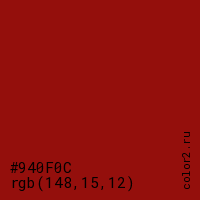 Цвет #940F0C в цветовой модели RGB обозначается тремя октетами (148, 15, 12) в десятичном формате и #940F0C в шестнадцатиричном (hex) формате, которые являются интенсивностью красного 148 (hex 94), интенсивность зелёного 15 (hex 0F) и интенсивность синего 12 (hex 0C).