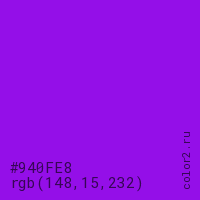 Цвет #940FE8 в цветовой модели RGB обозначается тремя октетами (148, 15, 232) в десятичном формате и #940FE8 в шестнадцатиричном (hex) формате, которые являются интенсивностью красного 148 (hex 94), интенсивность зелёного 15 (hex 0F) и интенсивность синего 232 (hex E8).