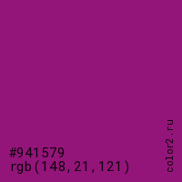 Цвет #941579 в цветовой модели RGB обозначается тремя октетами (148, 21, 121) в десятичном формате и #941579 в шестнадцатиричном (hex) формате, которые являются интенсивностью красного 148 (hex 94), интенсивность зелёного 21 (hex 15) и интенсивность синего 121 (hex 79).