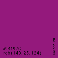 Цвет #94197C в цветовой модели RGB обозначается тремя октетами (148, 25, 124) в десятичном формате и #94197C в шестнадцатиричном (hex) формате, которые являются интенсивностью красного 148 (hex 94), интенсивность зелёного 25 (hex 19) и интенсивность синего 124 (hex 7C).