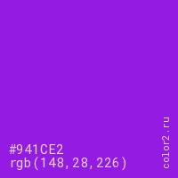 Цвет #941CE2 в цветовой модели RGB обозначается тремя октетами (148, 28, 226) в десятичном формате и #941CE2 в шестнадцатиричном (hex) формате, которые являются интенсивностью красного 148 (hex 94), интенсивность зелёного 28 (hex 1C) и интенсивность синего 226 (hex E2).