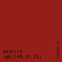 Цвет #941F19 в цветовой модели RGB обозначается тремя октетами (148, 31, 25) в десятичном формате и #941F19 в шестнадцатиричном (hex) формате, которые являются интенсивностью красного 148 (hex 94), интенсивность зелёного 31 (hex 1F) и интенсивность синего 25 (hex 19).