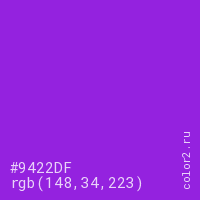 Цвет #9422DF в цветовой модели RGB обозначается тремя октетами (148, 34, 223) в десятичном формате и #9422DF в шестнадцатиричном (hex) формате, которые являются интенсивностью красного 148 (hex 94), интенсивность зелёного 34 (hex 22) и интенсивность синего 223 (hex DF).