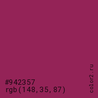 Цвет #942357 в цветовой модели RGB обозначается тремя октетами (148, 35, 87) в десятичном формате и #942357 в шестнадцатиричном (hex) формате, которые являются интенсивностью красного 148 (hex 94), интенсивность зелёного 35 (hex 23) и интенсивность синего 87 (hex 57).