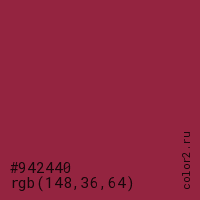 Цвет #942440 в цветовой модели RGB обозначается тремя октетами (148, 36, 64) в десятичном формате и #942440 в шестнадцатиричном (hex) формате, которые являются интенсивностью красного 148 (hex 94), интенсивность зелёного 36 (hex 24) и интенсивность синего 64 (hex 40).