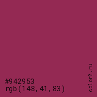 Цвет #942953 в цветовой модели RGB обозначается тремя октетами (148, 41, 83) в десятичном формате и #942953 в шестнадцатиричном (hex) формате, которые являются интенсивностью красного 148 (hex 94), интенсивность зелёного 41 (hex 29) и интенсивность синего 83 (hex 53).