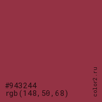 Цвет #943244 в цветовой модели RGB обозначается тремя октетами (148, 50, 68) в десятичном формате и #943244 в шестнадцатиричном (hex) формате, которые являются интенсивностью красного 148 (hex 94), интенсивность зелёного 50 (hex 32) и интенсивность синего 68 (hex 44).