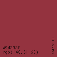 Цвет #94333F в цветовой модели RGB обозначается тремя октетами (148, 51, 63) в десятичном формате и #94333F в шестнадцатиричном (hex) формате, которые являются интенсивностью красного 148 (hex 94), интенсивность зелёного 51 (hex 33) и интенсивность синего 63 (hex 3F).
