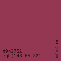 Цвет #943752 в цветовой модели RGB обозначается тремя октетами (148, 55, 82) в десятичном формате и #943752 в шестнадцатиричном (hex) формате, которые являются интенсивностью красного 148 (hex 94), интенсивность зелёного 55 (hex 37) и интенсивность синего 82 (hex 52).