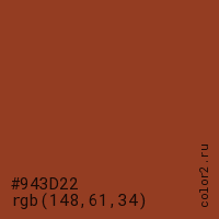 Цвет #943D22 в цветовой модели RGB обозначается тремя октетами (148, 61, 34) в десятичном формате и #943D22 в шестнадцатиричном (hex) формате, которые являются интенсивностью красного 148 (hex 94), интенсивность зелёного 61 (hex 3D) и интенсивность синего 34 (hex 22).