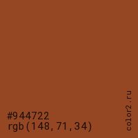 Цвет #944722 в цветовой модели RGB обозначается тремя октетами (148, 71, 34) в десятичном формате и #944722 в шестнадцатиричном (hex) формате, которые являются интенсивностью красного 148 (hex 94), интенсивность зелёного 71 (hex 47) и интенсивность синего 34 (hex 22).