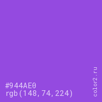 Цвет #944AE0 в цветовой модели RGB обозначается тремя октетами (148, 74, 224) в десятичном формате и #944AE0 в шестнадцатиричном (hex) формате, которые являются интенсивностью красного 148 (hex 94), интенсивность зелёного 74 (hex 4A) и интенсивность синего 224 (hex E0).