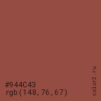 Цвет #944C43 в цветовой модели RGB обозначается тремя октетами (148, 76, 67) в десятичном формате и #944C43 в шестнадцатиричном (hex) формате, которые являются интенсивностью красного 148 (hex 94), интенсивность зелёного 76 (hex 4C) и интенсивность синего 67 (hex 43).