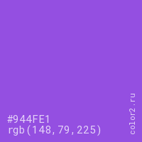 Цвет #944FE1 в цветовой модели RGB обозначается тремя октетами (148, 79, 225) в десятичном формате и #944FE1 в шестнадцатиричном (hex) формате, которые являются интенсивностью красного 148 (hex 94), интенсивность зелёного 79 (hex 4F) и интенсивность синего 225 (hex E1).