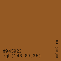 Цвет #945923 в цветовой модели RGB обозначается тремя октетами (148, 89, 35) в десятичном формате и #945923 в шестнадцатиричном (hex) формате, которые являются интенсивностью красного 148 (hex 94), интенсивность зелёного 89 (hex 59) и интенсивность синего 35 (hex 23).