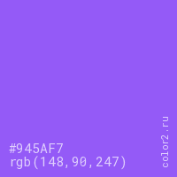 Цвет #945AF7 в цветовой модели RGB обозначается тремя октетами (148, 90, 247) в десятичном формате и #945AF7 в шестнадцатиричном (hex) формате, которые являются интенсивностью красного 148 (hex 94), интенсивность зелёного 90 (hex 5A) и интенсивность синего 247 (hex F7).