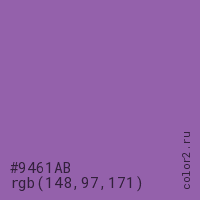 Цвет #9461AB в цветовой модели RGB обозначается тремя октетами (148, 97, 171) в десятичном формате и #9461AB в шестнадцатиричном (hex) формате, которые являются интенсивностью красного 148 (hex 94), интенсивность зелёного 97 (hex 61) и интенсивность синего 171 (hex AB).
