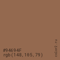 Цвет #94694F в цветовой модели RGB обозначается тремя октетами (148, 105, 79) в десятичном формате и #94694F в шестнадцатиричном (hex) формате, которые являются интенсивностью красного 148 (hex 94), интенсивность зелёного 105 (hex 69) и интенсивность синего 79 (hex 4F).