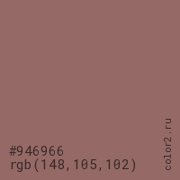 Цвет #946966 в цветовой модели RGB обозначается тремя октетами (148, 105, 102) в десятичном формате и #946966 в шестнадцатиричном (hex) формате, которые являются интенсивностью красного 148 (hex 94), интенсивность зелёного 105 (hex 69) и интенсивность синего 102 (hex 66).