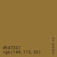 Цвет #947337 в цветовой модели RGB обозначается тремя октетами (148, 115, 55) в десятичном формате и #947337 в шестнадцатиричном (hex) формате, которые являются интенсивностью красного 148 (hex 94), интенсивность зелёного 115 (hex 73) и интенсивность синего 55 (hex 37).