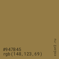 Цвет #947B45 в цветовой модели RGB обозначается тремя октетами (148, 123, 69) в десятичном формате и #947B45 в шестнадцатиричном (hex) формате, которые являются интенсивностью красного 148 (hex 94), интенсивность зелёного 123 (hex 7B) и интенсивность синего 69 (hex 45).
