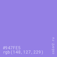 Цвет #947FE5 в цветовой модели RGB обозначается тремя октетами (148, 127, 229) в десятичном формате и #947FE5 в шестнадцатиричном (hex) формате, которые являются интенсивностью красного 148 (hex 94), интенсивность зелёного 127 (hex 7F) и интенсивность синего 229 (hex E5).