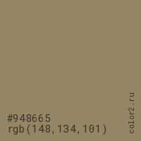 Цвет #948665 в цветовой модели RGB обозначается тремя октетами (148, 134, 101) в десятичном формате и #948665 в шестнадцатиричном (hex) формате, которые являются интенсивностью красного 148 (hex 94), интенсивность зелёного 134 (hex 86) и интенсивность синего 101 (hex 65).