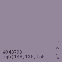 Цвет #94879B в цветовой модели RGB обозначается тремя октетами (148, 135, 155) в десятичном формате и #94879B в шестнадцатиричном (hex) формате, которые являются интенсивностью красного 148 (hex 94), интенсивность зелёного 135 (hex 87) и интенсивность синего 155 (hex 9B).