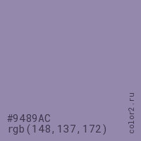 Цвет #9489AC в цветовой модели RGB обозначается тремя октетами (148, 137, 172) в десятичном формате и #9489AC в шестнадцатиричном (hex) формате, которые являются интенсивностью красного 148 (hex 94), интенсивность зелёного 137 (hex 89) и интенсивность синего 172 (hex AC).