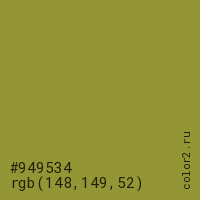 Цвет #949534 в цветовой модели RGB обозначается тремя октетами (148, 149, 52) в десятичном формате и #949534 в шестнадцатиричном (hex) формате, которые являются интенсивностью красного 148 (hex 94), интенсивность зелёного 149 (hex 95) и интенсивность синего 52 (hex 34).