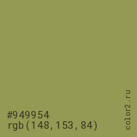 Цвет #949954 в цветовой модели RGB обозначается тремя октетами (148, 153, 84) в десятичном формате и #949954 в шестнадцатиричном (hex) формате, которые являются интенсивностью красного 148 (hex 94), интенсивность зелёного 153 (hex 99) и интенсивность синего 84 (hex 54).