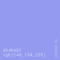 Цвет #949AEF в цветовой модели RGB обозначается тремя октетами (148, 154, 239) в десятичном формате и #949AEF в шестнадцатиричном (hex) формате, которые являются интенсивностью красного 148 (hex 94), интенсивность зелёного 154 (hex 9A) и интенсивность синего 239 (hex EF).