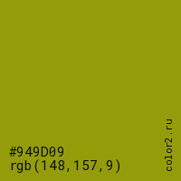 Цвет RGB(148, 157, 9) в процентом отношении количества цвета состоит из 58% красного (red), 61.6% зелёного (green) и 3.5% синего (blue).