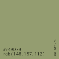 Цвет #949D70 в цветовой модели RGB обозначается тремя октетами (148, 157, 112) в десятичном формате и #949D70 в шестнадцатиричном (hex) формате, которые являются интенсивностью красного 148 (hex 94), интенсивность зелёного 157 (hex 9D) и интенсивность синего 112 (hex 70).