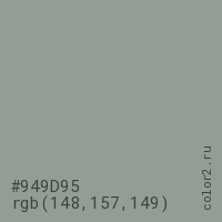 Цвет #949D95 в цветовой модели RGB обозначается тремя октетами (148, 157, 149) в десятичном формате и #949D95 в шестнадцатиричном (hex) формате, которые являются интенсивностью красного 148 (hex 94), интенсивность зелёного 157 (hex 9D) и интенсивность синего 149 (hex 95).