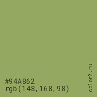 Цвет #94A862 в цветовой модели RGB обозначается тремя октетами (148, 168, 98) в десятичном формате и #94A862 в шестнадцатиричном (hex) формате, которые являются интенсивностью красного 148 (hex 94), интенсивность зелёного 168 (hex A8) и интенсивность синего 98 (hex 62).