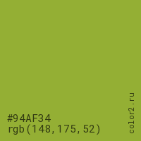 Цвет #94AF34 в цветовой модели RGB обозначается тремя октетами (148, 175, 52) в десятичном формате и #94AF34 в шестнадцатиричном (hex) формате, которые являются интенсивностью красного 148 (hex 94), интенсивность зелёного 175 (hex AF) и интенсивность синего 52 (hex 34).