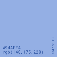 Цвет #94AFE4 в цветовой модели RGB обозначается тремя октетами (148, 175, 228) в десятичном формате и #94AFE4 в шестнадцатиричном (hex) формате, которые являются интенсивностью красного 148 (hex 94), интенсивность зелёного 175 (hex AF) и интенсивность синего 228 (hex E4).