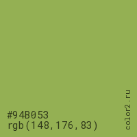 Цвет #94B053 в цветовой модели RGB обозначается тремя октетами (148, 176, 83) в десятичном формате и #94B053 в шестнадцатиричном (hex) формате, которые являются интенсивностью красного 148 (hex 94), интенсивность зелёного 176 (hex B0) и интенсивность синего 83 (hex 53).