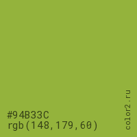 Цвет RGB(148, 179, 60) в процентом отношении количества цвета состоит из 58% красного (red), 70.2% зелёного (green) и 23.5% синего (blue).