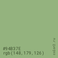 Цвет #94B37E в цветовой модели RGB обозначается тремя октетами (148, 179, 126) в десятичном формате и #94B37E в шестнадцатиричном (hex) формате, которые являются интенсивностью красного 148 (hex 94), интенсивность зелёного 179 (hex B3) и интенсивность синего 126 (hex 7E).