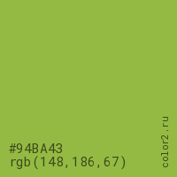 Цвет #94BA43 в цветовой модели RGB обозначается тремя октетами (148, 186, 67) в десятичном формате и #94BA43 в шестнадцатиричном (hex) формате, которые являются интенсивностью красного 148 (hex 94), интенсивность зелёного 186 (hex BA) и интенсивность синего 67 (hex 43).
