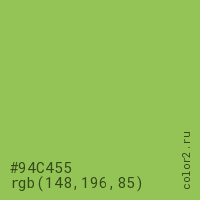 Цвет #94C455 в цветовой модели RGB обозначается тремя октетами (148, 196, 85) в десятичном формате и #94C455 в шестнадцатиричном (hex) формате, которые являются интенсивностью красного 148 (hex 94), интенсивность зелёного 196 (hex C4) и интенсивность синего 85 (hex 55).