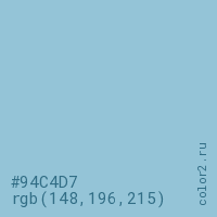 Цвет #94C4D7 в цветовой модели RGB обозначается тремя октетами (148, 196, 215) в десятичном формате и #94C4D7 в шестнадцатиричном (hex) формате, которые являются интенсивностью красного 148 (hex 94), интенсивность зелёного 196 (hex C4) и интенсивность синего 215 (hex D7).