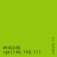 Цвет #94C60B в цветовой модели RGB обозначается тремя октетами (148, 198, 11) в десятичном формате и #94C60B в шестнадцатиричном (hex) формате, которые являются интенсивностью красного 148 (hex 94), интенсивность зелёного 198 (hex C6) и интенсивность синего 11 (hex 0B).