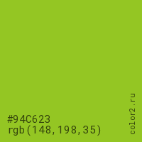 Цвет #94C623 в цветовой модели RGB обозначается тремя октетами (148, 198, 35) в десятичном формате и #94C623 в шестнадцатиричном (hex) формате, которые являются интенсивностью красного 148 (hex 94), интенсивность зелёного 198 (hex C6) и интенсивность синего 35 (hex 23).