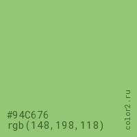 Цвет #94C676 в цветовой модели RGB обозначается тремя октетами (148, 198, 118) в десятичном формате и #94C676 в шестнадцатиричном (hex) формате, которые являются интенсивностью красного 148 (hex 94), интенсивность зелёного 198 (hex C6) и интенсивность синего 118 (hex 76).
