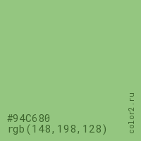 Цвет #94C680 в цветовой модели RGB обозначается тремя октетами (148, 198, 128) в десятичном формате и #94C680 в шестнадцатиричном (hex) формате, которые являются интенсивностью красного 148 (hex 94), интенсивность зелёного 198 (hex C6) и интенсивность синего 128 (hex 80).