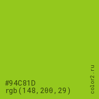Цвет #94C81D в цветовой модели RGB обозначается тремя октетами (148, 200, 29) в десятичном формате и #94C81D в шестнадцатиричном (hex) формате, которые являются интенсивностью красного 148 (hex 94), интенсивность зелёного 200 (hex C8) и интенсивность синего 29 (hex 1D).